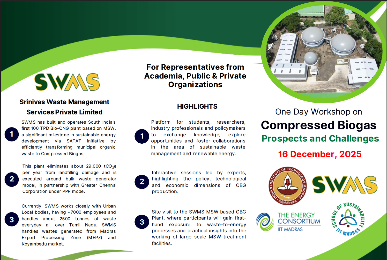 A one-day workshop on Compressed Biogas (CBG): Prospects & Challenges was held on 16 December 2025 at IIT Madras. The program was organised by Srinivas Waste Management Services Private Limited (SWMS) in collaboration with IIT Madras, the School of Sustainability, IIT Madras and The Energy Consortium, IIT Madras, bringing together stakeholders to discuss the future of CBG in Indiaās clean energy landscape.